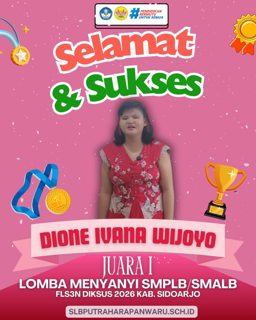 Dione Ivana Wijoyo, siswi SMPLB/SMALB, berhasil meraih Juara I. Penampilan Dione yang penuh percaya diri dan penghayatan mendalam membuatnya layak menjadi juara pertama dalam kompetisi yang diikuti oleh berbagai sekolah luar biasa di Sidoarjo.